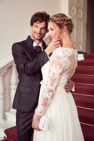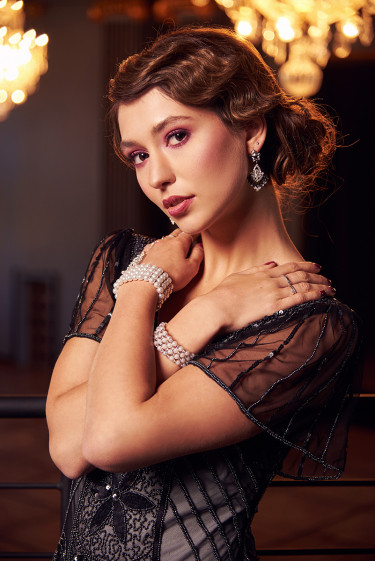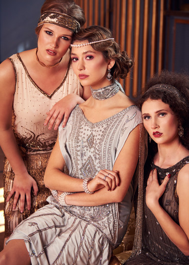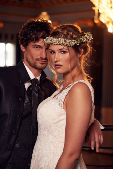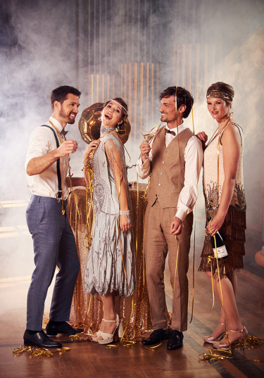 „Die 20er-Jahre-Ästhetik übt eine ungeheure Faszination aus – das zeigt auch die Begeisterung beispielsweise für „Babylon Berlin“ oder „The Great Gatsby“. Den historischen Stil habe ich durch moderne Elemente aufgelockert: Die Models posieren nicht so wie damals, sondern ich zeige junge Leute von heute, die ausgelassen feiern. Einer der Männer trägt Ohrring. Solche Details sind mir wichtig. Außerdem arbeite ich gern mit Curvy Models: Die Braut trägt Kleidergröße 42! Sie sieht „ganz normal“ aus – und genau das ist es: Curvy Models repräsentieren die durchschnittliche Konfektionsgröße in Deutschland. Sie sind authentisch und haben eine tolle Ästhetik! Mal ehrlich: Wer trägt schon die Modelgröße 34?“